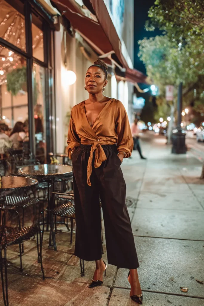 This outfit pairs a warm brown wrap style top with dark wide leg pants. The wrap detail highlights the waist while the pants add flow and movement. Neutral heels keep the look grounded and elegant. The overall vibe feels stylish comfortable and perfect for a long dinner.