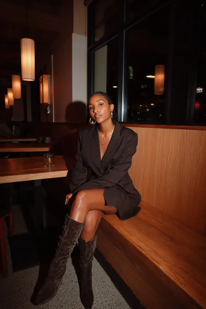 This outfit features a deep brown blazer style mini dress with a tailored fit that feels sharp and feminine at the same time. The structured shoulders balance the shorter hem while knee high brown boots add texture and confidence to the look. The rich tones feel bold and polished under warm dinner lighting. The overall vibe is powerful sleek and effortlessly cool.