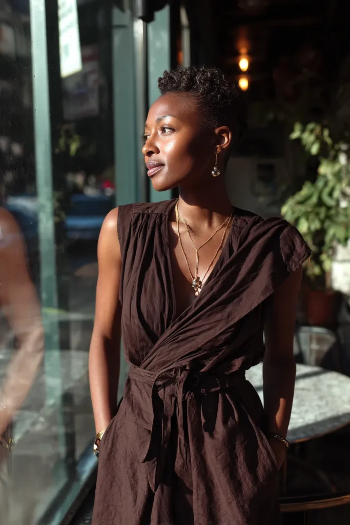 This look centers on a deep chocolate brown wrap dress with a soft drape and flattering waist tie. The sleeveless cut keeps it elegant while allowing the fabric to move beautifully with every step. Minimal accessories keep the focus on the rich color and silhouette. The vibe feels warm romantic and perfectly refined for dinner.