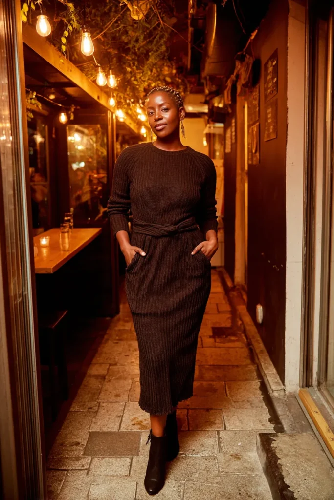 This look pairs a fitted brown ribbed knit top with a matching or slightly darker midi skirt. The textures do all the work here with the knit adding depth and the skirt flowing effortlessly as you walk. Neutral heels keep everything streamlined and chic. The overall feel is warm and cozy with a refined dinner ready finish.