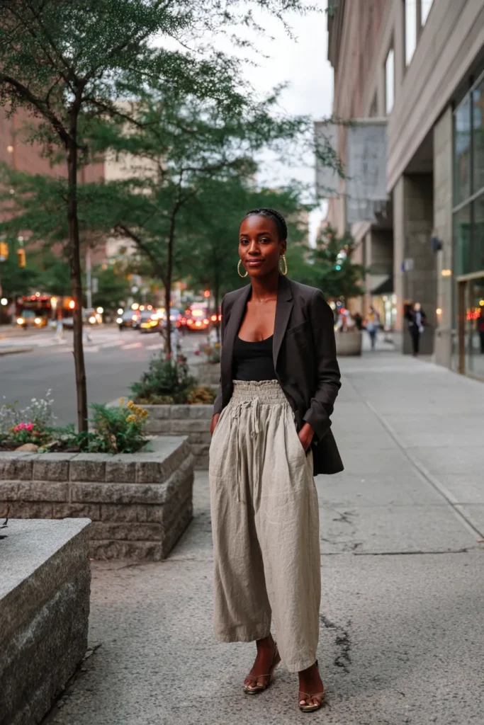 Here we have soft neutral wide leg pants paired with a darker brown or black top for contrast. The pants flow effortlessly and give the outfit a relaxed silhouette while the fitted top adds balance. Simple heels and a small bag keep the look clean and modern. The overall vibe feels city chic and very wearable.