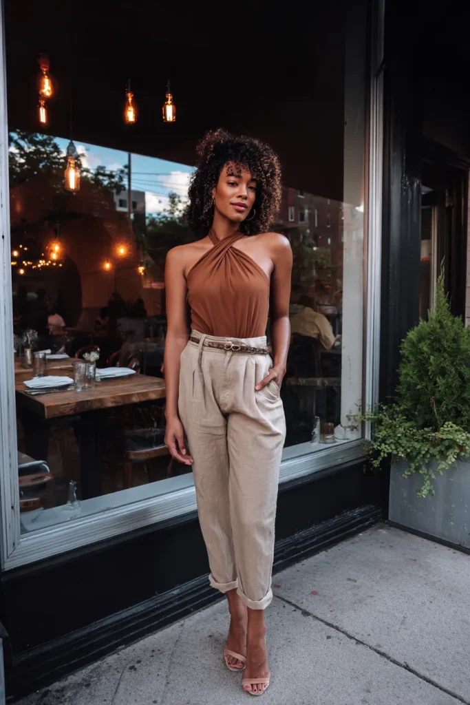 This outfit features a brown halter style top paired with light neutral high waisted pants. The top highlights the shoulders while the pants keep the look relaxed and balanced. Simple heels and minimal accessories let the silhouette shine. The vibe is fresh modern and perfect for a chic dinner plan.