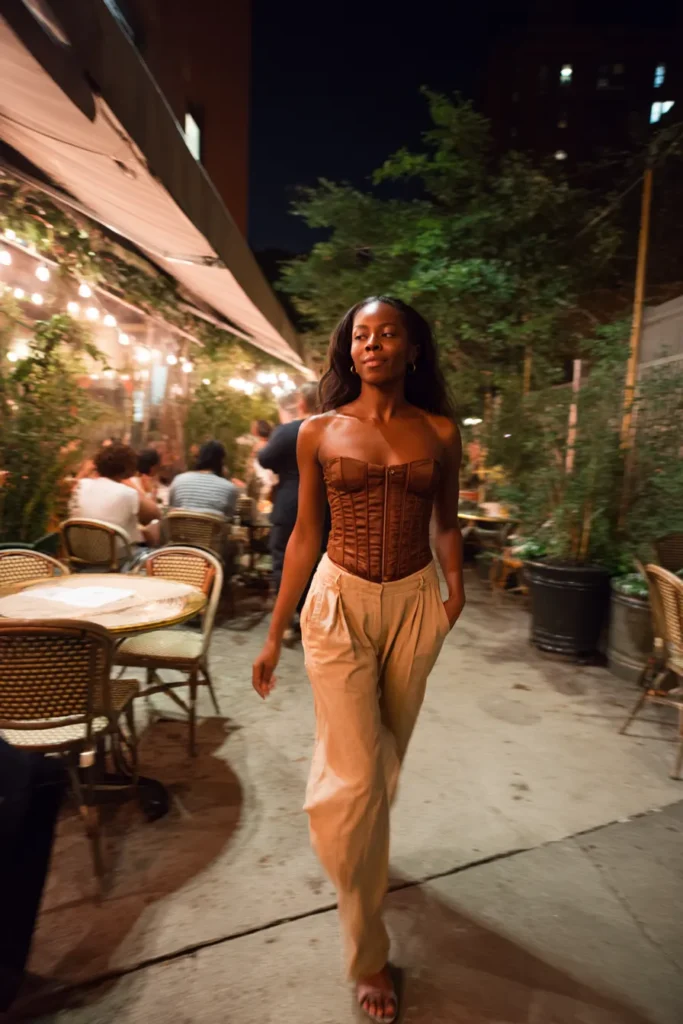 This look pairs a corset inspired brown top with soft neutral pants for a warm and romantic dinner outfit. The structured top adds shape while the pants keep the look easy and comfortable. Heeled sandals finish it off with a feminine touch. The overall vibe feels rich stylish and effortlessly put together.