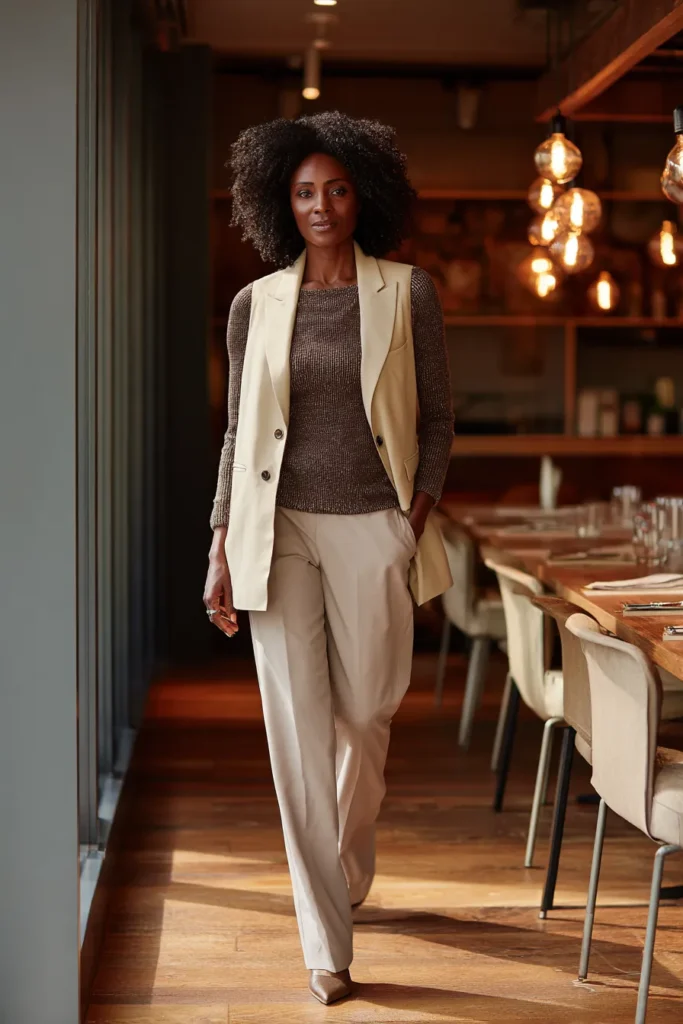 This outfit features a tailored beige vest worn over a soft brown top with matching relaxed trousers. The clean lines of the vest add structure while the neutral tones keep everything warm and approachable. Simple heels and minimal accessories let the textures and fit do the talking. The overall vibe feels polished but easy which works beautifully for dinner.