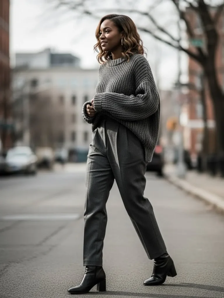 This look features a chunky gray knit sweater paired with tailored gray trousers and black heeled ankle boots. The oversized sweater brings coziness, while the structured pants keep the outfit sleek and refined. The neutral palette makes it feel modern and easy to style.