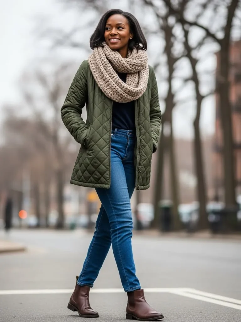 This outfit combines a quilted olive coat with a thick beige knit scarf, dark top, and blue jeans. Brown ankle boots finish the look with a warm touch. The scarf adds texture and extra warmth, making the outfit feel cozy and inviting from head to toe.
