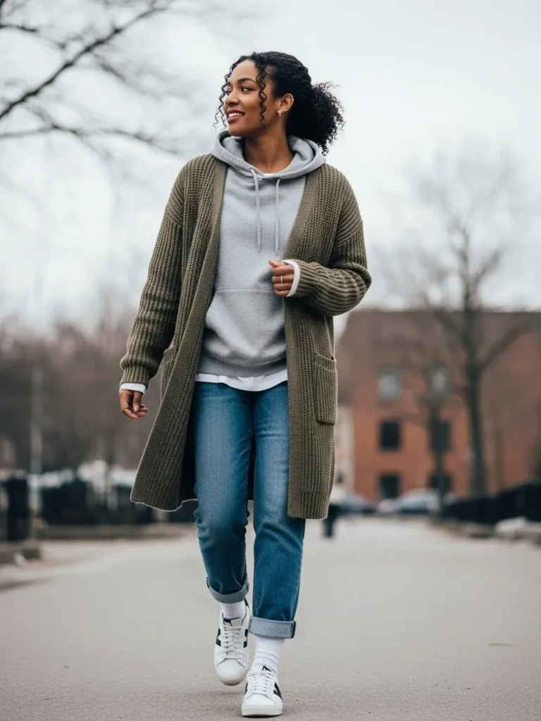 This outfit layers a long knit cardigan over a gray hoodie and white tee, paired with cuffed jeans and classic white sneakers. The mix of soft knits and casual basics gives it a laid back, cozy vibe that still feels put together. It is relaxed, warm, and perfect for everyday winter wear.