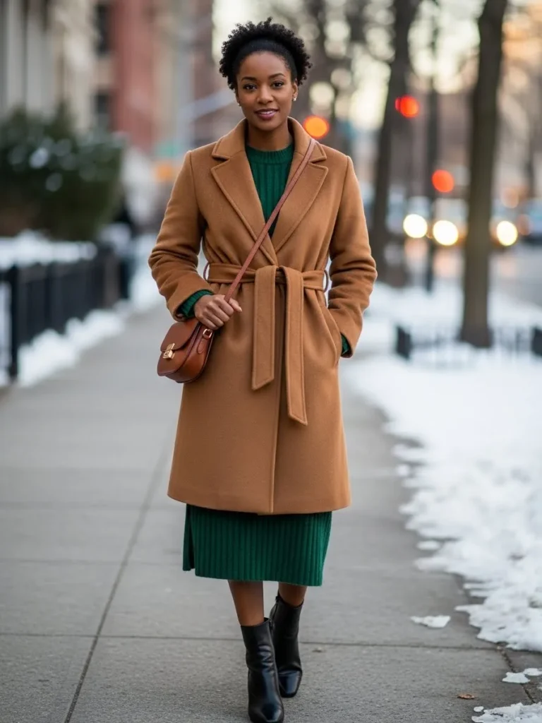 This outfit pairs a soft camel wrap coat with a rich green knit dress that falls just below the knee. The belted waist adds shape, while black ankle boots keep the look grounded and winter ready. A small brown crossbody bag adds a polished finishing touch without taking away from the clean lines.