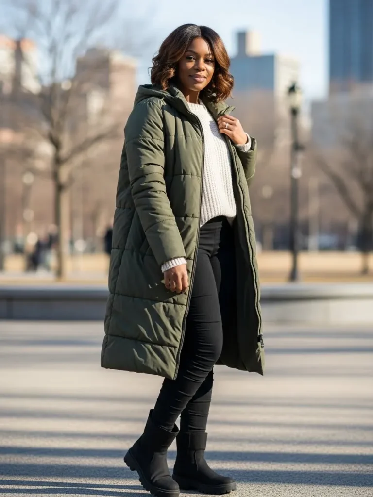 This outfit combines a long olive puffer coat with a light knit sweater and black fitted pants. The length of the coat adds extra warmth, while black boots keep everything sleek and practical. The neutral layers underneath keep the look balanced and clean.