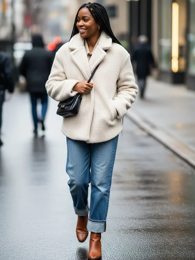 This look features a cozy cream teddy jacket paired with relaxed blue jeans and brown leather boots. A small black crossbody bag adds contrast and keeps the outfit feeling city ready. The soft texture of the jacket makes the whole look feel inviting.