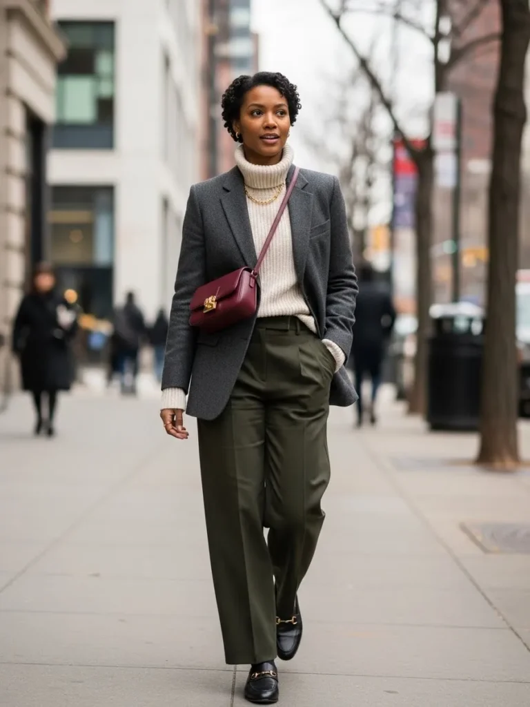 This outfit pairs a gray tailored blazer with a cream turtleneck and olive green trousers. Loafers add a classic touch, while a deep colored crossbody bag brings in a bit of contrast. The layers feel clean, structured, and very wearable.