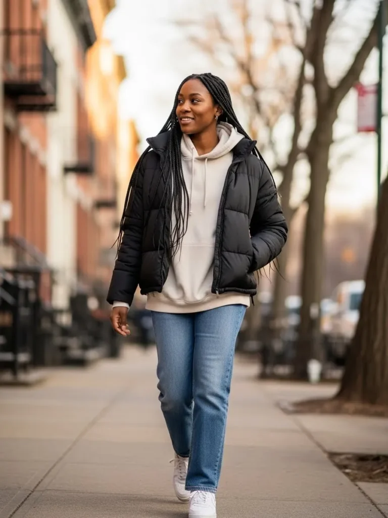 This outfit features a black puffer jacket layered over a soft light gray hoodie, paired with classic blue jeans and clean white sneakers. The layers feel cozy and practical, while the neutral colors keep the look simple and easy. It has that effortless winter street style vibe that works for everyday wear.
