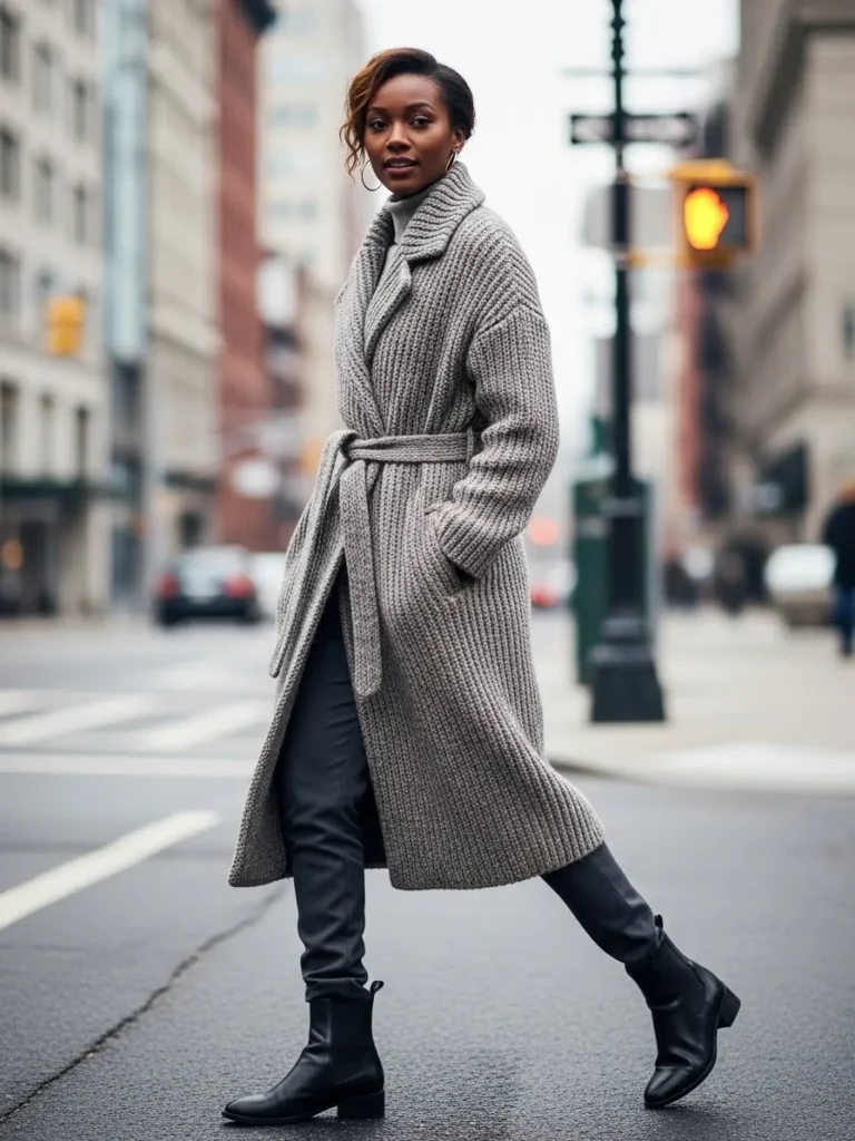 This look centers around a textured gray belted coat paired with slim dark pants and sleek black boots. The belt adds shape, and the longer length makes it feel extra warm and polished. Everything about this outfit feels refined but still wearable.