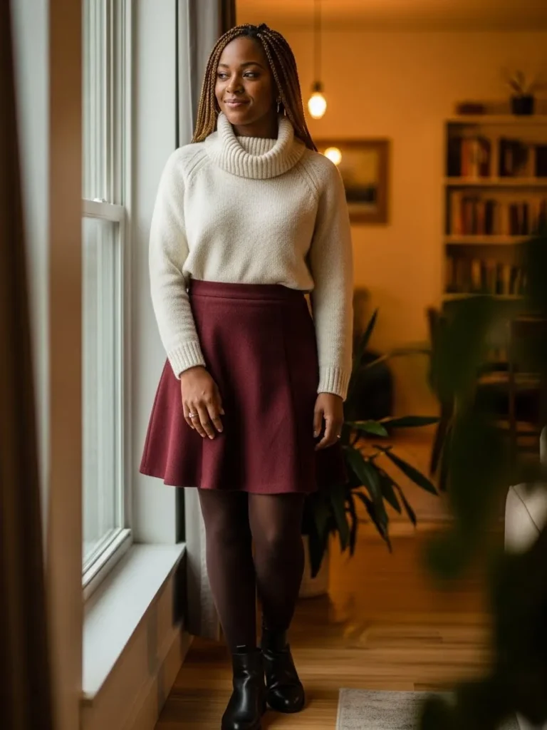This outfit combines a cozy cream turtleneck sweater with a deep burgundy skirt, sheer tights, and black ankle boots. The soft knit contrasts beautifully with the structured skirt, creating a balanced winter look that feels feminine and warm.