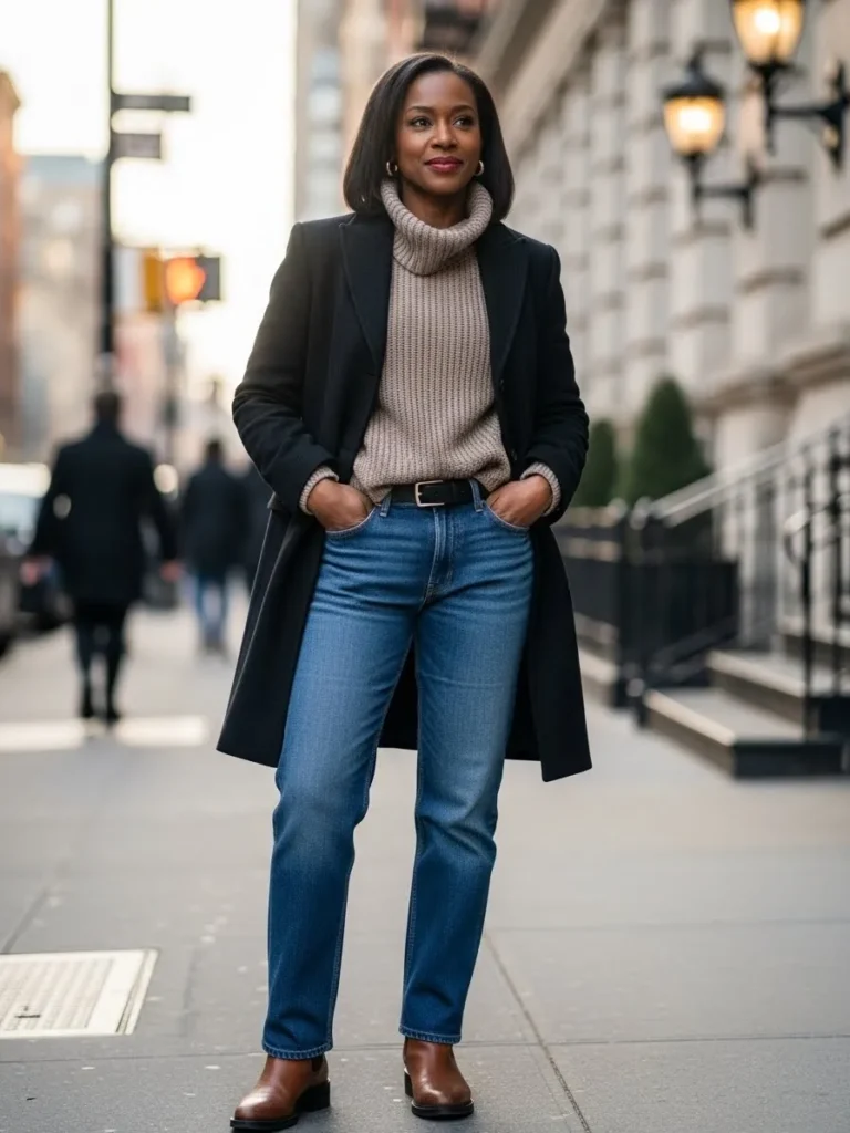 This look pairs a classic black coat with a chunky beige knit sweater and straight leg blue jeans. Brown ankle boots add warmth and depth, keeping the outfit grounded and timeless. The overall vibe feels clean, cozy, and city ready.