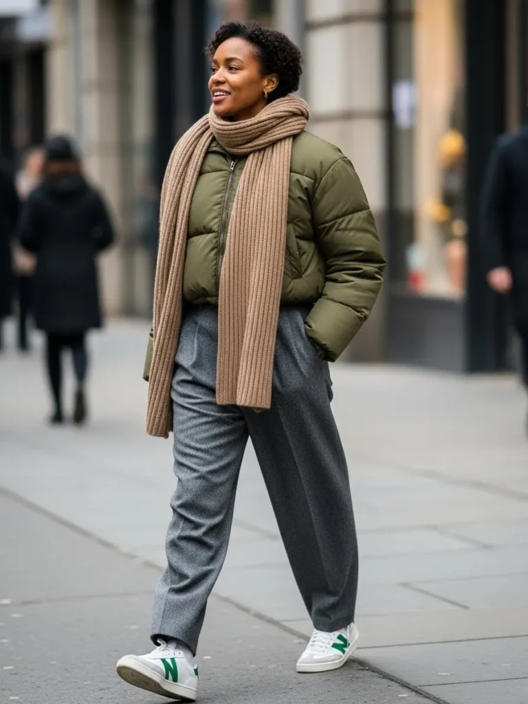 This outfit features an olive green puffer jacket paired with tailored gray trousers, a thick neutral scarf, and sporty sneakers. The mix of structured pants and cozy layers makes it feel balanced and modern.