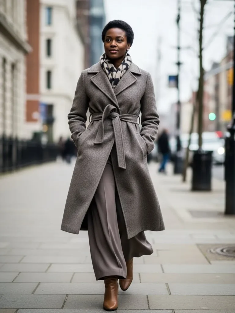 This outfit centers around a tailored gray wool coat cinched at the waist with a belt. Underneath, soft neutral layers flow beautifully with wide leg pants and brown leather boots. A patterned scarf adds just enough interest while keeping the color palette calm and refined.