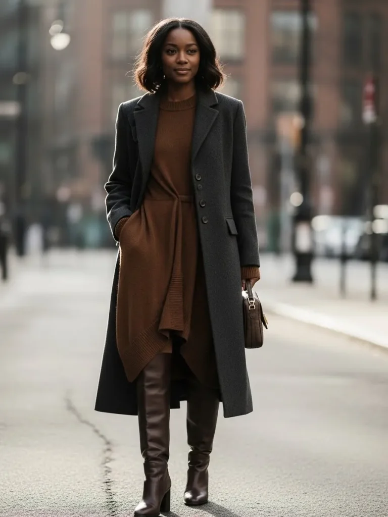 This outfit features a long dark coat worn over a warm brown knit dress, paired with tall leather boots. The clean lines and rich winter tones give it a timeless feel, while the structured coat keeps everything looking sleek and intentional.