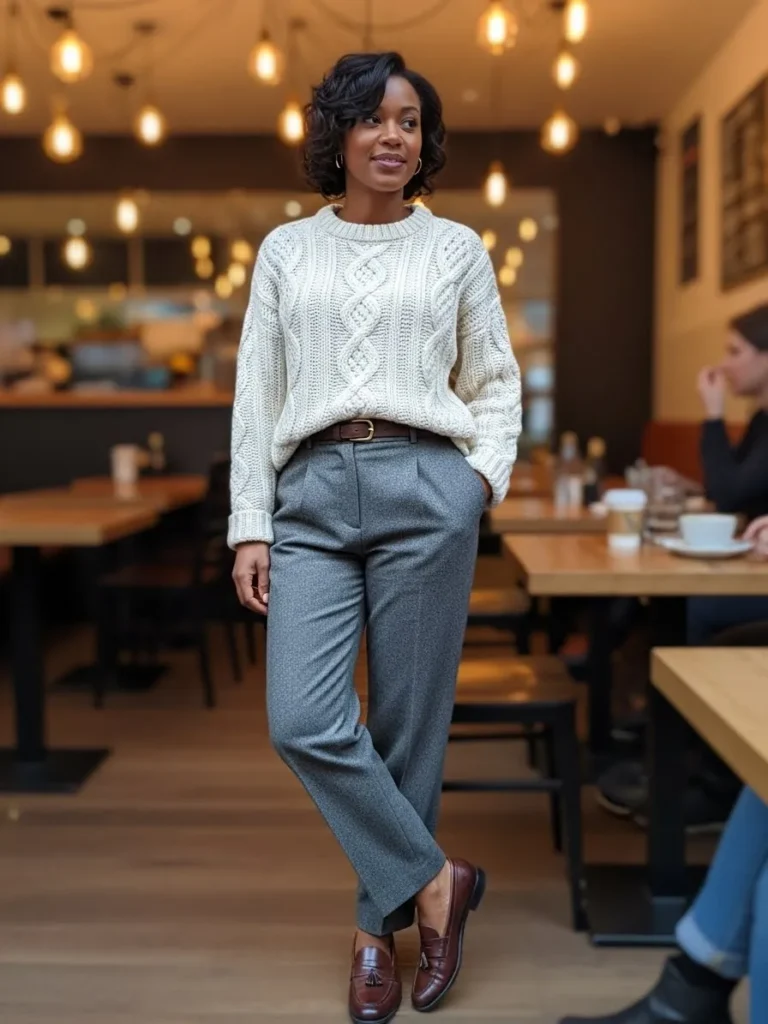 This look combines a chunky cream cable knit sweater with tailored gray trousers and polished loafers. The relaxed fit of the sweater balances beautifully with the clean lines of the pants. The warm café setting makes the outfit feel cozy, classic, and quietly stylish.
