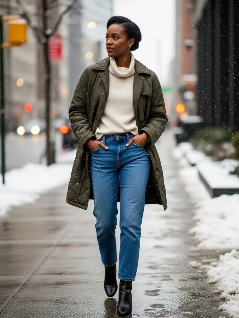 This outfit features an olive quilted jacket layered over a soft cream turtleneck and classic blue jeans. The jacket adds warmth without bulk, while the slim jeans and black ankle boots keep the look clean and balanced. The neutral tones feel timeless, and the overall vibe is calm, polished, and perfect for winter city walks.