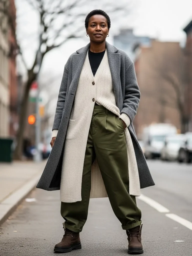 This outfit mixes a long cream knit cardigan with olive green utility pants and sturdy ankle boots. A darker top underneath grounds the lighter layers, and the relaxed fit makes everything feel comfortable and wearable. The textures add depth while keeping the look practical and warm.